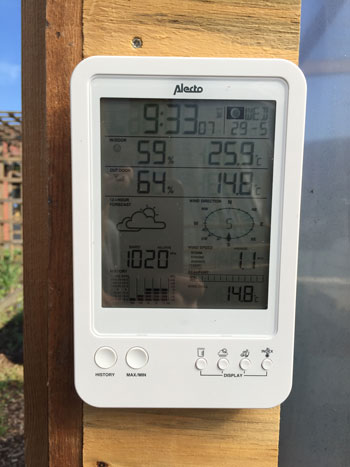 29 mei, half tien in de morgen is het al 25 graden bij de planten, wat een luxe! De luchtvochtigheid daalt overdag langzaam naar 40 procent. De Frisian duck is toch iets speciaals, zie hoe gelukkig ze is!