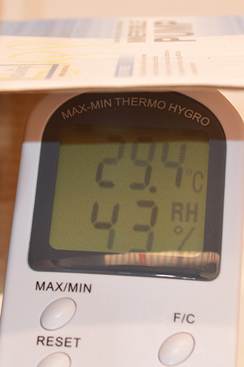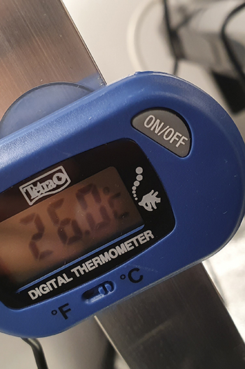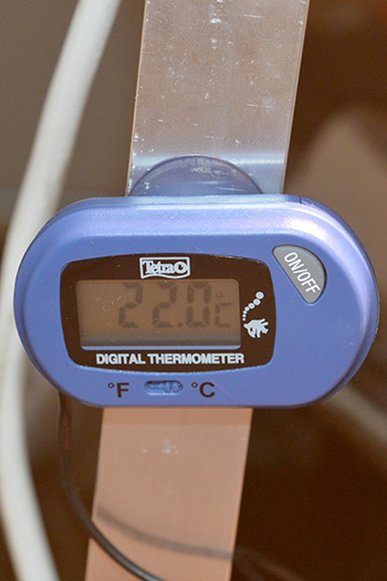 Misschien weet je nog dat ik het systeem twee weken geleden alvast in mijn CNNBS G-Kit (met XL verhogingsset) had gezet, om het te testen. Ik vulde het systeem daarna met water, en zette de 150 Watt G-Bars LED aan, zodat ik de temperatuur van het water en de temperatuur in de kast kon meten. In de kast zette ik dus een min-max thermometer en in het waterreservoir hing ik een aquarium-thermometer.