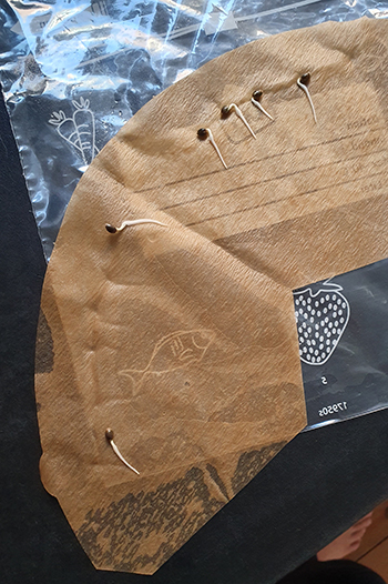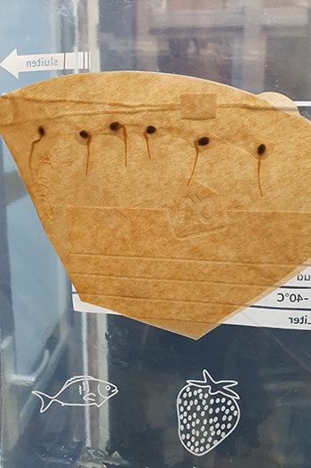 Nou ja, de wietsoort Mohammed dan. Ik heb daarvoor zes zaden laten ontkiemen, waarvan ik de beste vijf in de kweekkast heb gezet. Uiteraard weer op de gebruikelijke manier in een koffiefilter, verticaal opgehangen in een gripzak. Ik doe dit altijd zo, simpelweg omdat het zo altijd lukt. Door het zakje heen zie je meteen wanneer de zaden ontkiemd zijn, en bovendien groeien de worteltjes op deze manier kaarsrecht, zodat je ze gemakkelijk kunt poten.