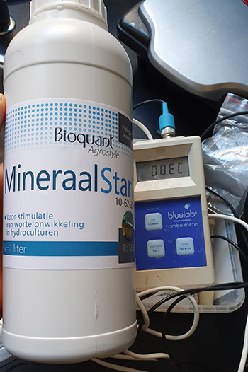In deze eerste kweekweek bevat het voedingswater BioQuant MineraalStart, Plagron pH-min, en een paar druppels Vitalize van Mills. MineraalStart bevat stikstof, fosfor en kalium in een verhouding 10-62-20, wat voor een snelle wortelontwikkeling moet zorgen. Met de pH-min heb ik het water op een pH-waarde van 5,9 gebracht en de Vitalize zorgt voor gezonde vitale plantjes. De EC-waarde is 0,9 en blijft tot nu toe heel stabiel, net als de pH-waarde.