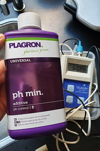 Omdat dit een hydrokweek wordt, is het belangrijk dat mijn pH- en EC-meter goed werken. Ik heb een combometer van Bluelab, alleen is die al een jaar of 9 oud. Ik was er niet helemaal zeker van of de pH-sensor nog wel goed was, en kreeg van Pendergast de tip om dit even te checken met een flesje Spa blauw. Spa blauw heeft namelijk altijd een pH-waarde van precies 6,0. Zonder hem geijkt te hebben gaf mijn pH-meter 5,9 aan, dus de sensor functioneert na 9 jaar nog prima! Topspul, dat Buelab.