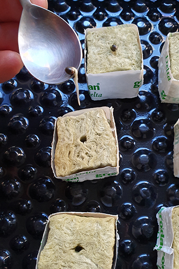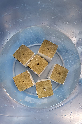 Op 28 augustus deed ik de zaadjes tussen het koffiefilter, en op 31 augustus kon ik ze in steenwolpluggen poten. Normaal gesproken deed ik dat in aarde, dus het was even wennen voor me. Ik heb een liter water aangemaakt met daarin BioQuant MineraalStart (EC-waarde 0,8) wat ik aanzuurde tot een pH-waarde van 6,0 met pH-min van Plagron. In dat water heb ik de steenwolblokjes even laten weken, ze uitgeknepen en er voorzichtig de zaadjes in geplaatst. Na twee dagen in mijn stekkasje (propagator) heb ik ze in het Flow Hydroponics Systeem gezet.