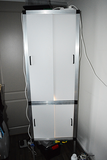 Om de watertemperatuur lager te houden, heb ik het reservoir daarom buiten de kast gezet. Om precies te zijn eronder. Hiervoor heb ik de lange poten van het hydrosysteem, en het waterreservoir onder de kast gezet. Deze aanpassing zorgt er trouwens ook meteen voor dat je ín de kast veel ruimte bespaard, zodat je het hydrosysteem ook zónder XL verhogingsset kunt gebruiken. Een win-win situatie dus, maar je moet er wel twee gaten voor boren in de bodem van je CNNBS G-Kit.