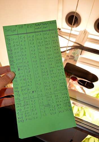 Op de foto’s hieronder zie je de dikke wortelmassa van de Mohammeds, en een foto van de wortels die het lef hadden om in mijn overloop te groeien. Ik voeg ook foto’s bij van de pH- en EC-waardes en de temperatuur en luchtvochtigheid en de temperatuur van het water (20,8 graden Celsius). Ik hou alles met regelmaat bij, zodat ik in geval van een probleem wat makkelijker kan achterhalen waar het aan gelegen heeft.