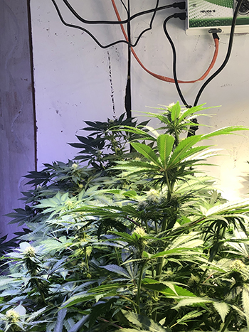 De planten in het scrognet zijn de Flower Power en Skunk XL. Onder het net vind je in totaal negen wietplanten; deze bevinden zich in de achterste helft van mijn kweekruimte. Deze dames werden zó groot, dat ik wel een scrognet moést installeren voor ze.