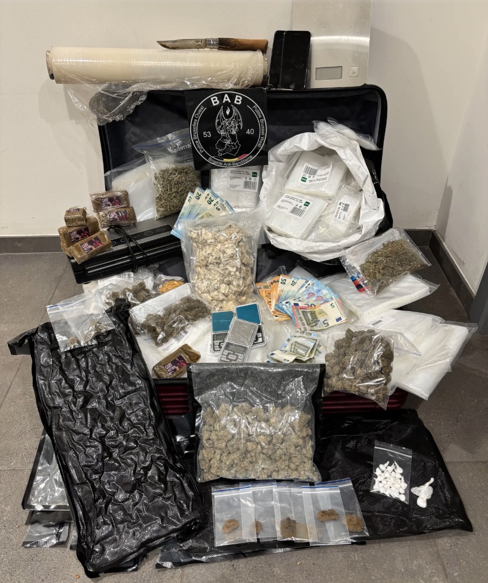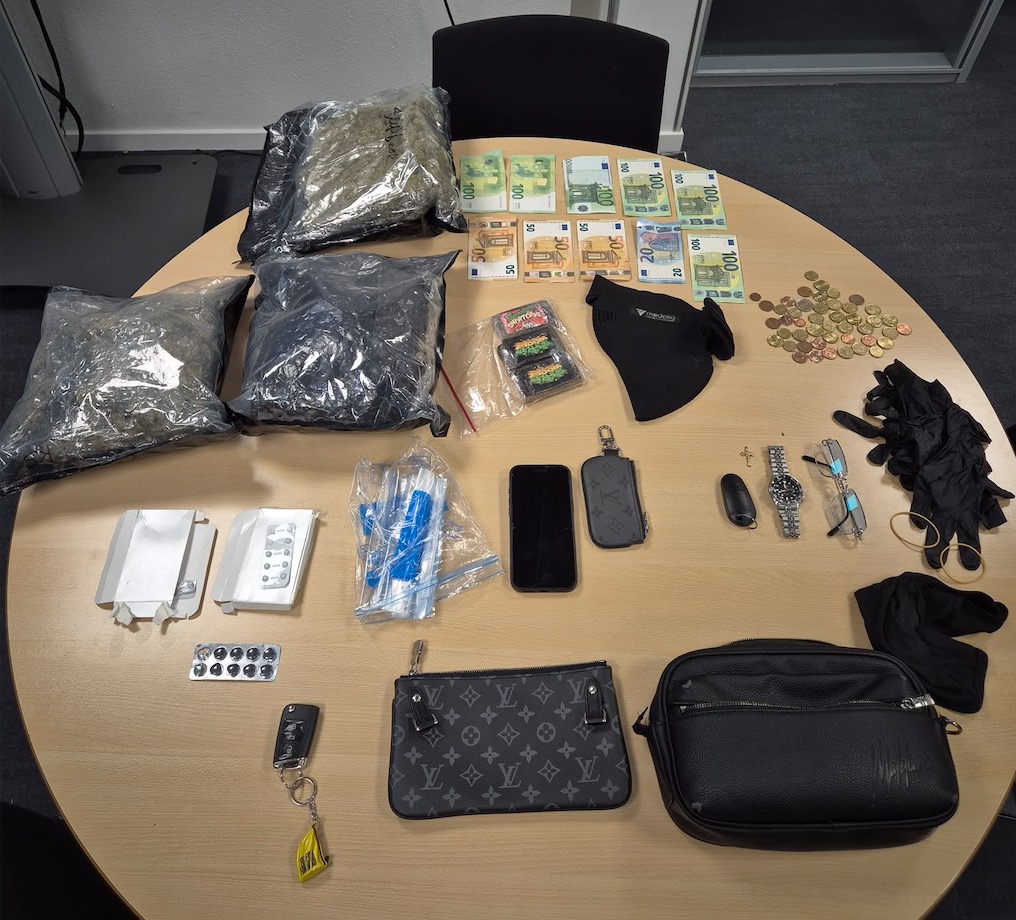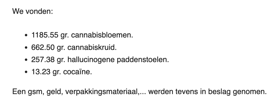 Geen flauw idee wat dát dan weer voor politiemensen zijn, maar het gaat om de inhoud uiteindelijk. En die bestaat hier uit 3 kilo wiet, 3 ons hasj, contant geld (niet geteld) en de verschrikkelijke misdaden van het in bezit hebben van ‘gezicht bedekkende skimutsen’ en ‘merkkleding en accessoires’.