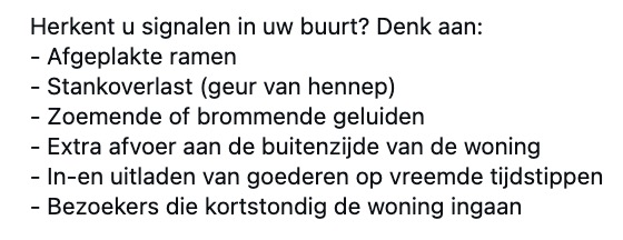 Wat ze bij de politie hier dan weer wel doen, is nóg meer burgers oproepen om hardwerkende plantenvrienden erbij te lappen. Inclusief een lijstje van “signalen” waar je als bange/brave/boosaardige burger op moet letten. Omdat wij daar theoretisch ook ons voordeel mee kunnen doen, kopiëren we die verraderlijke tiplijst gewoon. Dikke doei 🙋♂️