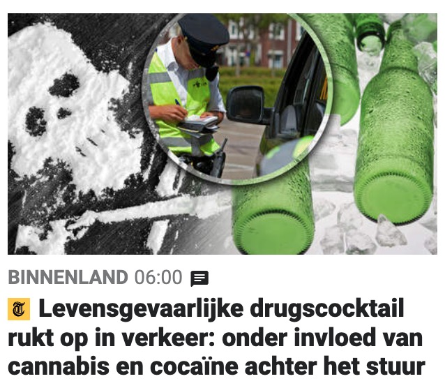 Het rijden onder invloed van meerdere soorten drugs noemt het NFI “levensgevaarlijk”. En dat is voor krantjes als De Telegraaf – beroemd in onze kringen vanwege o.a. hun ‘hasj plantages’ – voldoende aanleiding om met dit nieuwsbericht op de proppen te komen: