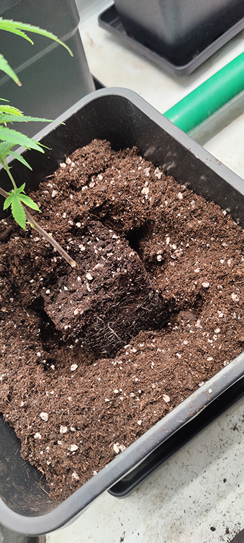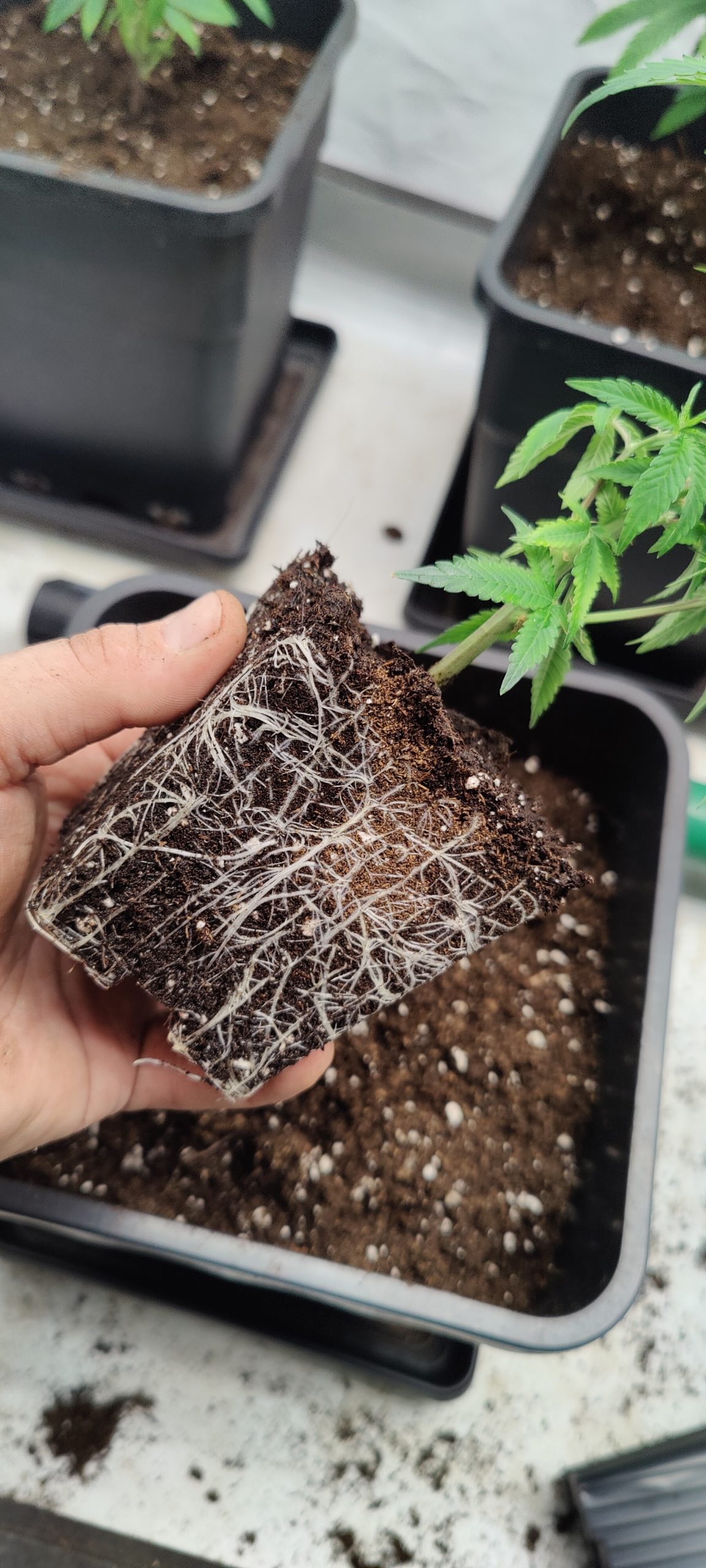 Na een kleine twee weken hadden de Apple Fritters genoeg wortels en konden ze verpot worden. We hebben een mooie selectie gekozen, en de plantjes naar de grote tent verhuist. Hier hebben we ze ook meteen verpot in 11-literpotten gevuld met BioBizz lightmix. Hierin zullen ze verder opgroeien en afbloeien. En nu de planten in de grote tent in grote potten staan, krijgen ze ook voeding voor grote planten.