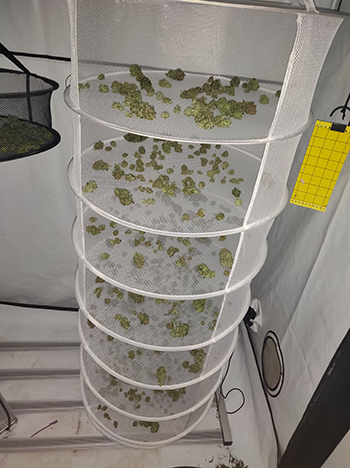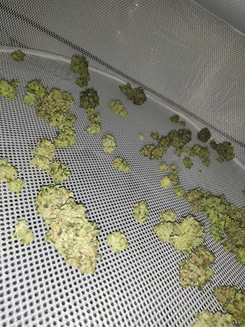 De grotere toppen knippen we volledig met de hand en voor de wat kleinere gebruiken we een spin-pro knipmachine. Deze machine lijkt wat op een sla-droger en verlost op een snelle manier alle kleinere topjes van hun blad. Als alles geknipt is leggen we alle toppen zorgvuldig op een droognet om ze vervolgens een weekje of twee met rust te laten.