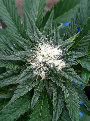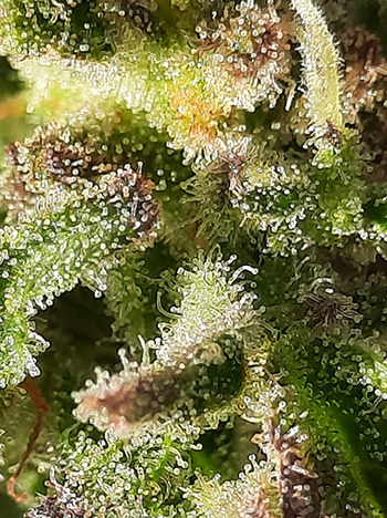 Een beloning van trichomen heb ik met de Girl Scout Cookies Automatic van Spliff Seeds. Ondanks dat ik haar vroeg heb laten ontkiemen, heeft ze de vocht en kou goed weten te doorstaan. De paarse bladeren vertellen dat ze het soms koud gehad heeft. Dit heeft waarschijnlijk wel een goede invloed gehad op de aanmaak van trichomen. Kan mij namelijk niet herinneren dat ik ooit zo’n trichomen uitbarsting bij een autoflower heb gezien. Ze is inmiddels geoogst maar moet nog even curen om op smaak te komen. Maar uit een kleine rooktest blijkt dat deze wel blijft plakken, zowel bij het draaien als het roken.