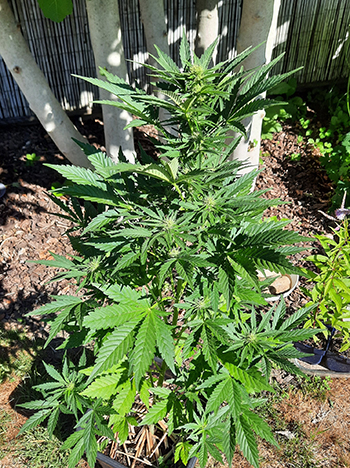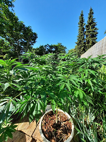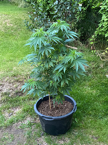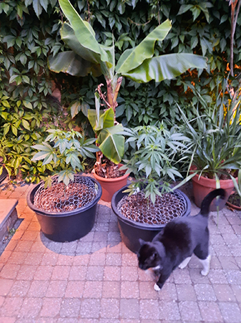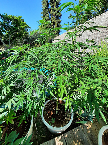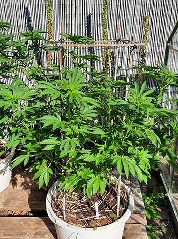 De fotoperiode-gevoelige cannabisplanten van Spliff Seeds zijn op hun plaats van bestemming gekomen. Ze staan nu in een 65 liter speciekuip. Ik gebruik witte kuipen want deze weerkaatsen meer zonlicht dan zwarte kuipen, waardoor de wortels bij felle zon minder heet worden.