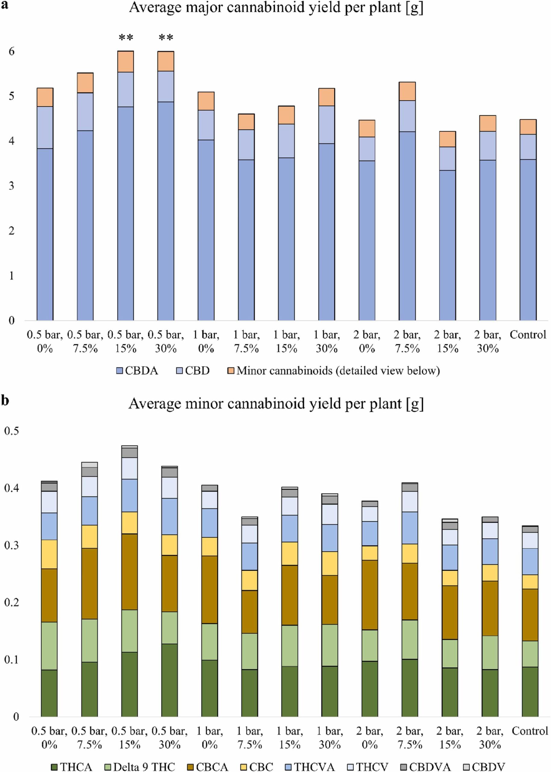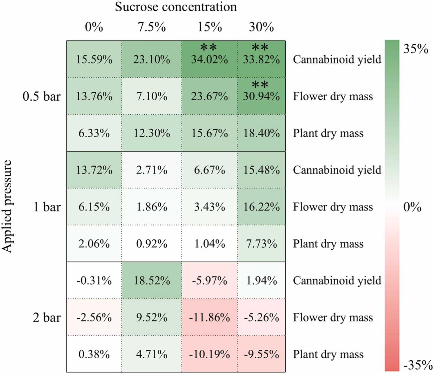 De morfologie van de planten werd aangetast, en het cannabinoïdengehalte daalde zelfs. Te veel druk beschadigde waarschijnlijk het vasculaire systeem, of zorgde voor osmotische stress.
