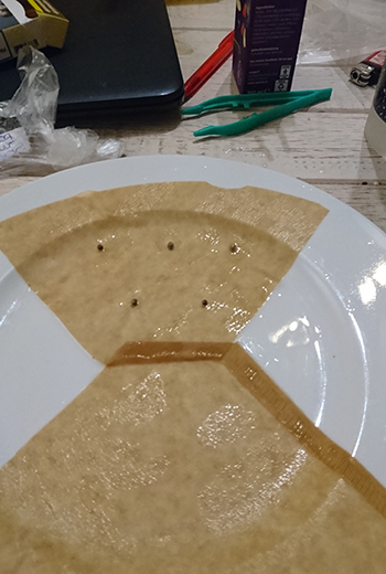 Ik moet echter wel in acht nemen dat de zaailingen 6 weken binnen zullen staan om voor te groeien tot het IJsheiligen is. 2 liter aarde zou genoeg ruimte moeten zijn voor de wortels om een mooie kluit te produceren en geen last van root bound (ruimtegebrek voor de wortels in de pot) te krijgen. De zaden worden ontkiemd door middel van de koffiefilter-methode. Daarbij voeg ik nog wat Plagron Seedbooster Plus toe aan het water waarmee ik de koffiefilters nat maak. Ik plaats de zakken met filters en zaad in oude shag blikken en plaats ze op een warme plaats. Elke zak met filter bevat één soort, dus het is belangrijk elke zak te labelen.