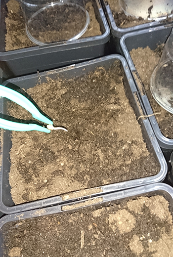 In de ochtend van 2 april kon ik 18 van de 26 zaailingen planten, en heb ik ze in de couveuse geplaatst. Na de pot een beetje ingewaterd te hebben, zijn de kiempjes in de 2-literpotten geplant. Daarna gaf ik de jongedames nog wat water met een pipet voorzien van Plagrons Seedbooster Plus. Als laatste zet ik over iedere zaailing een transparant bierglas om de luchtvochtigheid hoog te houden.