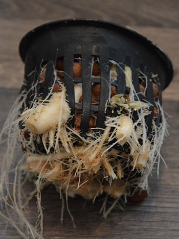 Na het oogsten was het tijd om het Flow Hydroponics 3-in-1 Systeem schoon te spoelen met bleekwater en daarna nog eens goed af te spoelen. Maar eerst heb ik natuurlijk een kijkje bij de wortels genomen. Die zagen er mooi wit en gezond uit. De plant had een superdikke penwortel aangemaakt die maar moeilijk door te knippen was met mijn snoeischaar. Het netpotje waar ze in stond heeft ze dan ook compleet uit elkaar getrokken.