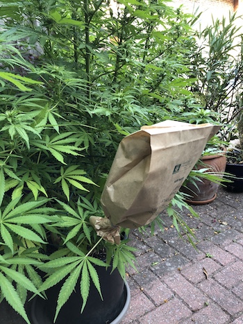 Indica #2 oftewel Mohammed, is afgelopen week bevrucht. Ik heb het Ghost Train Haze stuifmeel dat ik heb gekocht, gedeeltelijk in een papieren zak gedaan. Deze zak heb ik vervolgens over één van haar takken gedaan, vastgebonden en vervolgens na flink schudden een nachtje laten zitten. Het is nog wat vroeg om het resultaat te kunnen zien maar dat zal in m’n volgende verslag zeker aan de orde komen.