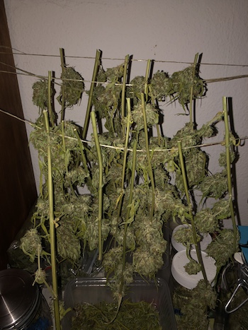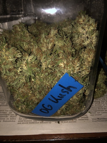Doordat deze OG Kush zo vroeg al begon te bloeien, heb ik nu wel weer een lekkere rookvoorraad. Ik heb er tot nu toe al ruim 85 gram schoon en droog afgehaald. Er hangt nog een klein gedeelte te drogen; als ik een schatting mag maken dan kom ik uiteindelijk ergens rond de 120 gram uit voor deze plant.