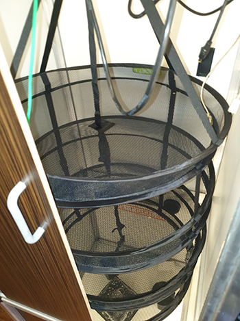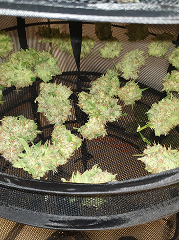 Na het knippen heb ik de CNNBS G-Kit (met verhogingsset) opnieuw ingericht als droogruimte. Hiervoor heb ik er een droognet in gehangen en daar het eerste deel van de oogst ingelegd. Op het bovenste deel heb ik de grote jongens liggen en daaronder de kleinere, enzovoort.