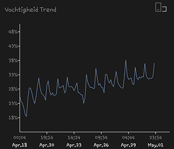 De 315 Watt CMH kweeklamp hangt 25 centimeter boven de dames. De gemiddelde temperatuur van de afgelopen twee weken was 25,18 graden Celsius, en is de afgelopen dagen iets aan het dalen. Dat komt omdat ik de deur wat vaker open heb staan met het mooie weer van de afgelopen tijd. De gemiddelde luchtvochtigheid was slechts 39,28 procent. Hier is een dip te zien waardoor ik er meteen achter kwam dat ik de plantjes te weinig water had gegeven.