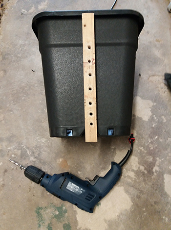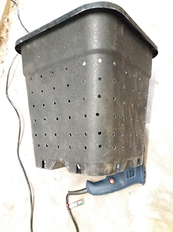 Ik krijg redelijk veel vragen over mijn potten. Dit zijn gewone 18-literpotten waarvan ik air-pots heb gemaakt. Van een plankje heb ik een boormal gemaakt en dan is het een kwestie van boren.