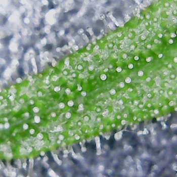 Zoals gebruikelijk in de laatste fase van de kweek, heb ik de microscoop erbij gepakt om de dames van heel dichtbij te bekijken. Als eerste mocht de AK Choco Kush een blaadje afstaan voor de ‘wetenschap’. Hier zien we de eerste amberkleurige trichomen verschijnen. Deze dame is bijna klaar, en zou officieel één week langer moeten dan de andere dames.