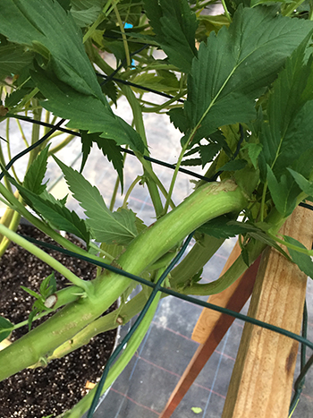 28 augustus: wat groeien die dames toch nog, dat is mooi om te zien! Sommige takken moet ik wat schuin hangen met touw, anders raken ze het plastic van mijn kas en dat vinden ze niet zo fijn. De gebogen takken zien er mooi en gezond uit. ▲