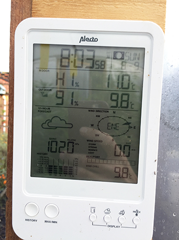 8 september: toch weer een heel stuk kouder dan twee weken geleden. ’s Morgens voor ik werken ga, vind ik de serre vol met water. Het is wat grondwater dat omhoog komt. Ik heb ontvochtigers neergezet en die het probleempje enigszins verholpen hebben. Ook is de luchtvochtigheid zeer hoog nu, goed verluchten om toprot te voorkomen is de boodschap. ▲