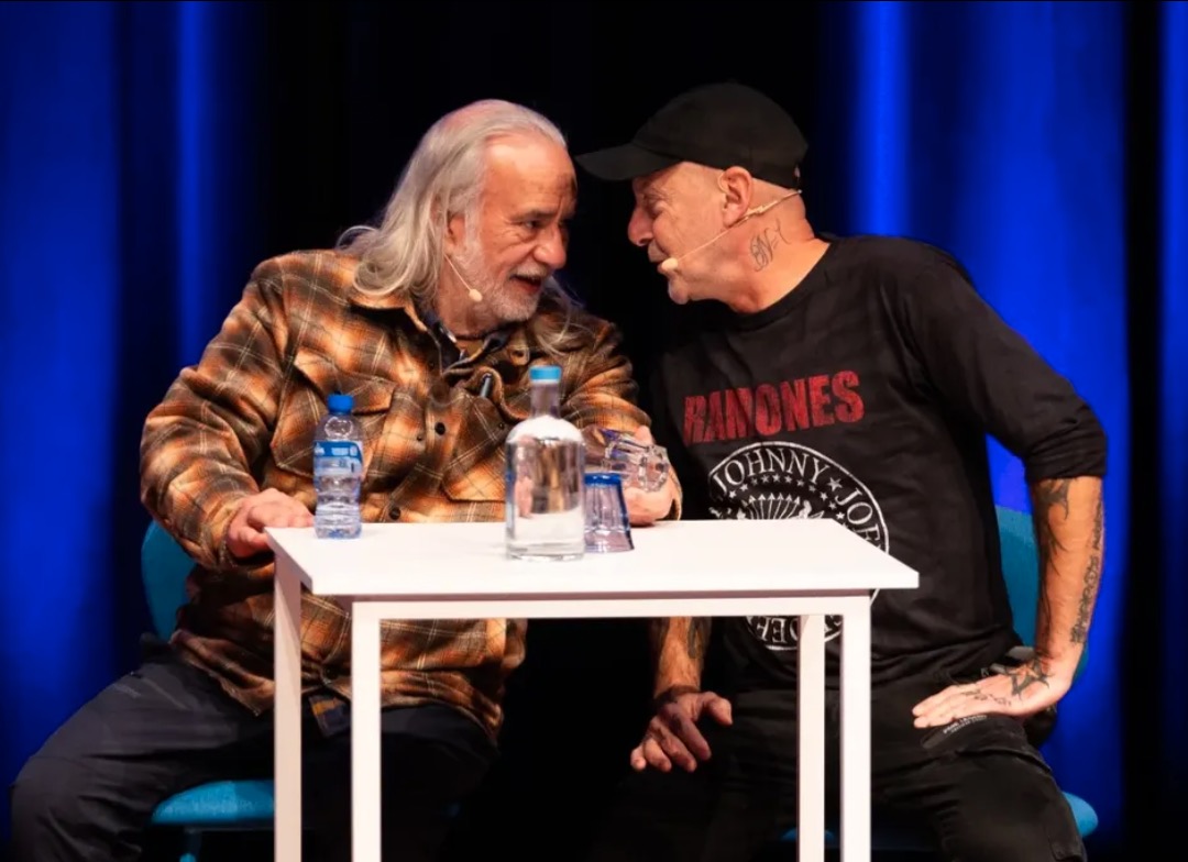 Onderonsje op het debat podium tussen wietolie goeroe Wernard Bruining (links) en CNNBS founding father Joop Mestrom.