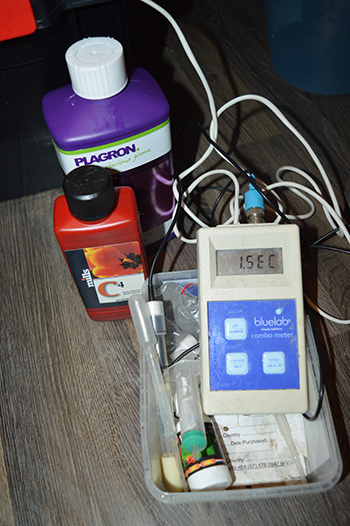 Stel ik de pH-waarde aan het begin van de dag (als de lampen net aan staan) in op ongeveer 5,8. De volgende ochtend is die alweer gedaald naar een pH-waarde tussen de 4,8 en 5,3. Het waterniveau daalt ook, dus de planten nemen genoeg water op. Maar de EC-waarde stijgt, zodat het bijna lijkt alsof de wietplanten alléén maar water opnemen, en geen voeding.