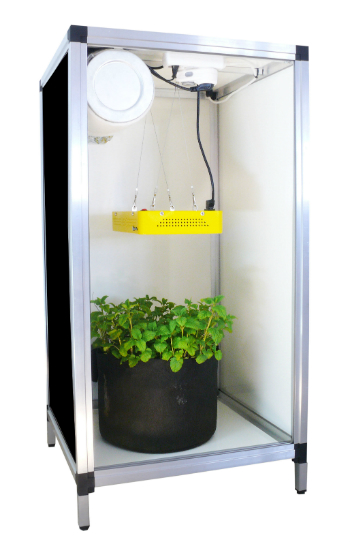 Deze kweekmachine komt compleet met alles wat je nodig hebt, je hoeft hem alleen nog even in elkaar te zetten, maar daar komt geen schroevendraaier bij aan te pas. Het is een kwestie van de aluminium profielen in elkaar schuiven, het plaatmateriaal in de profielen laten glijden en dan ben je klaar om midden in je woonkamer als je wilt te gaan kweken. De kast is namelijk niet groter dan 60 x 60 centimeter en ook in de hoogte heb je aan 1,15 meter genoeg. Binnenin de kast is er ruimte van 0,36 vierkante meter bij 1 meter 5 hoog voor je eigen plantjes.