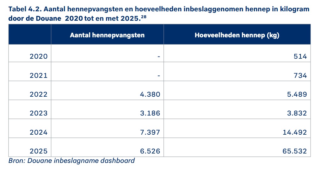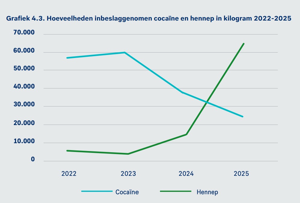 De toename van ‘hennepvangsten’ is niet alleen een Nederlands probleem. Ook in zee- en luchthavens in Duitsland, België, Spanje en het Verenigd Koninkrijk werd deze drug het afgelopen jaar veel vaker onderschept. Zo nam de Belgische Douane afgelopen jaar zo’n 25.000 kilo wiet in beslag. Meer dan vier keer zoveel als de 6.000 kilo in 2024.