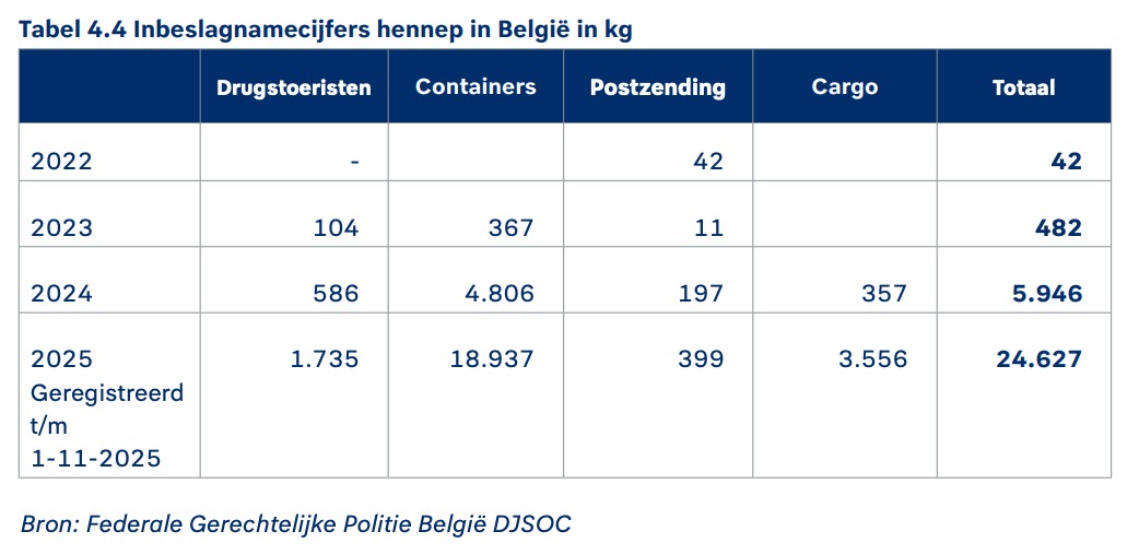 De toename van ‘hennepvangsten’ is niet alleen een Nederlands probleem. Ook in zee- en luchthavens in Duitsland, België, Spanje en het Verenigd Koninkrijk werd deze drug het afgelopen jaar veel vaker onderschept. Zo nam de Belgische Douane afgelopen jaar zo’n 25.000 kilo wiet in beslag. Meer dan vier keer zoveel als de 6.000 kilo in 2024.