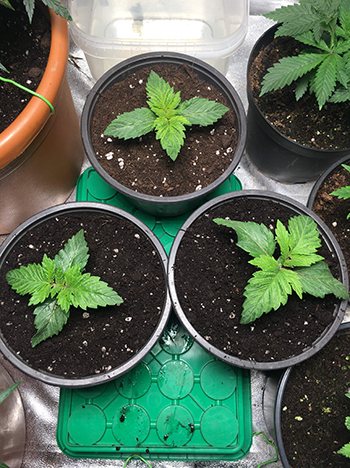 Vier Granddaddy Purple zaden laten ontkiemen en in kleine potjes aarde gezet voor de eerste weken. Alle vier de wietzaadjes kwamen zonder problemen uit.