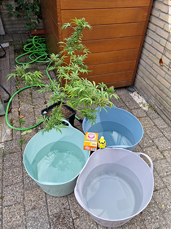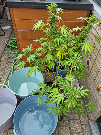 Natuurlijk weten de meeste kwekers al dat het plantformaat over het algemeen valt en staat met waar de voetjes in staan. As below, so above. Zoals je kan zien bij de dames in de kleinere potten zie je dat ze toch sneller last krijgen van voedingstekorten of substraat- of pH-issues. Het is dit jaar vooral door de droogte en mijn werk een probleem om de dames vochtig genoeg te houden. Ik zal dus volgend jaar zeker voor alle dames speciekuipen gebruiken icm Blumats. Een ingenieus systeem als je het mij vraagt!
