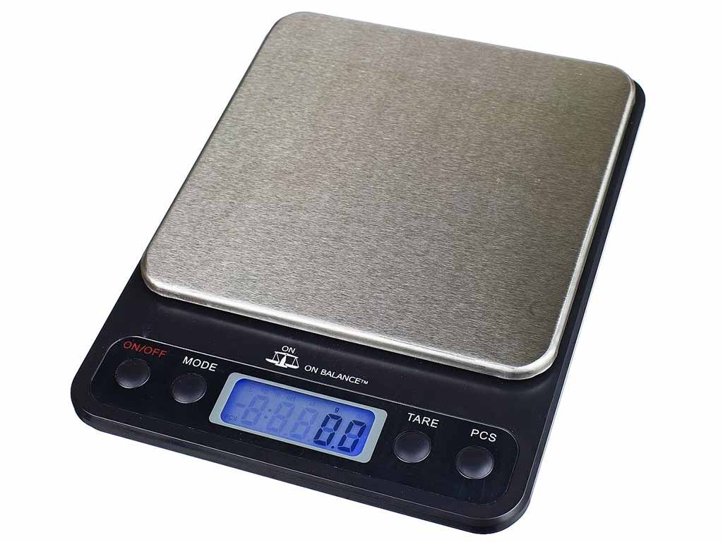 De On Balance weegschalen zijn 200 x 154 x 27 mm groot, en met slechts vier knoppen gemakkelijk in gebruik. Ze zijn on te stellen om in grammen te wegen maar kunnen dat ook in ozt of troy ounce (31,1034768 gram). Vier AA-batterijen worden bij beide modellen meegeleverd.
