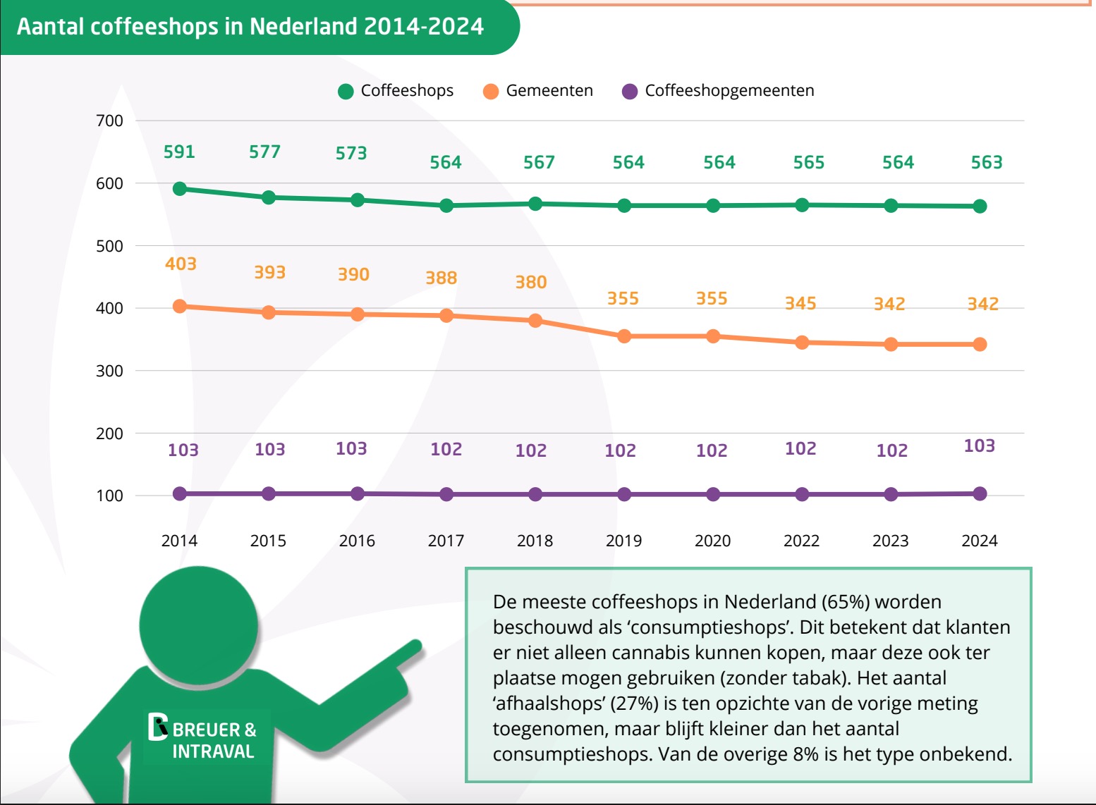 In de jaren negentig telde Nederland nog dik vijftienhonderd coffeeshops, maar dat aantal is daarna rap gedaald tot onder de zeshonderd anno 2024. Ten opzichte van 2017, de vorige keer dat onderzoeksbureau Breuer & Intraval een coffeeshoprapport voor de overheid (WODC) maakte, is er echter sprake van “weinig verandering” aldus de onderzoekers.
