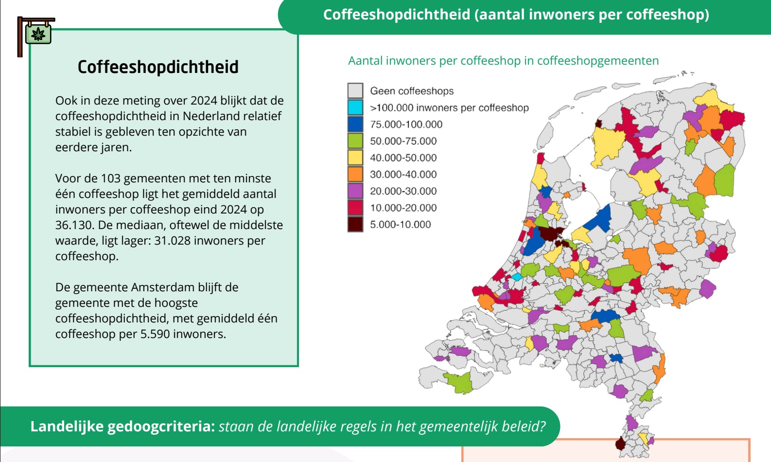 Eind 2024 hebben 103 van de 342 Nederlandse gemeenten samen 563 gedoogde verkooppunten van cannabis. In circa twee derde van de coffeeshops kunnen klanten niet alleen cannabis kopen, maar ook (zonder tabak) consumeren. In ruim een kwart (27%) kan alleen cannabis worden afgehaald.
