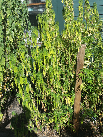 Twee van de drie buitenplanten van Lethos hebben een mysterieus probleem dat ervoor zorgt dat de bladeren zo slap hangen als een vaatdoekje. Zonde, want zo te zien zijn het joekels van wietplanten die Lethos een flinke wintervoorraad wiet hadden kunnen opleveren. Lieve Muna, wat is hier aan de hand?