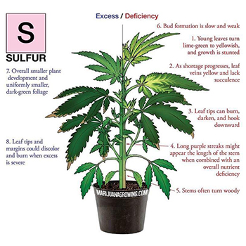 Als ik alleen naar de symptomen kijk, dan zou het een zwavel-tekort kunnen zijn of een fosfor-overschot. Kijk maar even naar de twee onderstaande plaatjes. Links zie je wat er gebeurt als een wietplant te veel of te weinig zwavel opneemt, en rechts zie je de gevolgen van een fosfor overschot en tekort. De symptomen lijken nog het meeste op een zwavel-tekort maar ik denk zelf meer aan een fosfor-overschot.