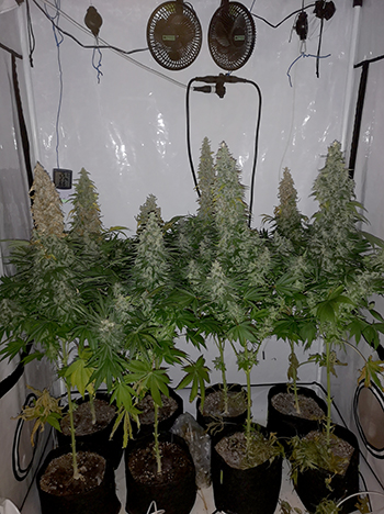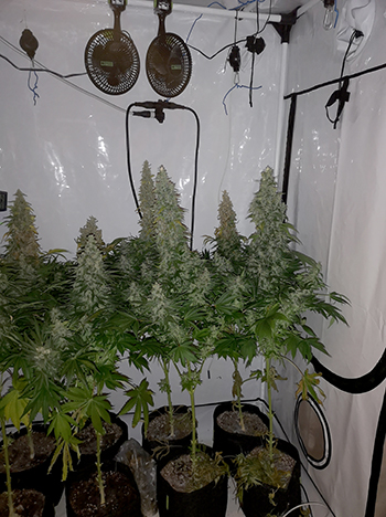 Bij het oogsten haal ik eerst alle bladeren van de plant af, waar geen kristallen opzitten. Daarna snijd ik de hele plant beneden aan de hoofdstam af. Dan hang ik ze ondersteboven aan touwtjes in mijn groei-tent, waar ik eerst de lampen uitgehaald heb. Nu kunnen de planten in het donker drogen. De afzuiger in de tent blijft aan op een lage stand, maar er staat geen ventilator aan. Dat is heel belangrijk, anders droogt de wiet te snel en verliest het zijn aroma. Na 10 dagen doe ik de knaktest en kijk of een zijtak al afbreekt (‘knakt’) als ik hem buig. Dat gebeurt, en daarmee kan ik de toppen van de planten afhalen en in glazen weckpotten doen om te laten rijpen.