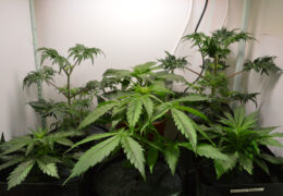 Omdat deze jongere wietplant ook een stuk kleiner is dan haar ‘kamergenoot’ heb ik haar met een omgekeerde lege pot en een stuk piepschuim verhoogd. En omdat deze plant ook helemaal niet getopt of getraind is voor binnen, heb ik de hoofdtop ge-supercropped. Zo groeien de hoogste toppen allemaal wat meer op gelijke hoogte, en wat dichter bij de kweeklamp.