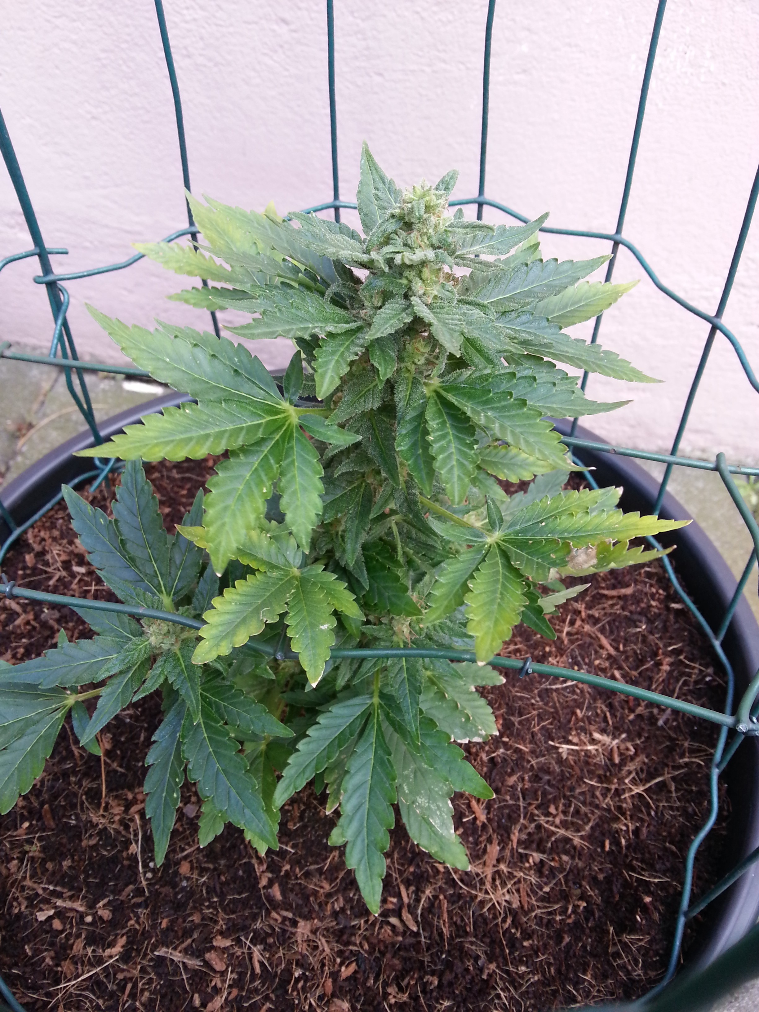 Hoewel de Early Skunk, die naast de Frisian Dew en Pasion #1 in de volle grond staat nog geen bloei laat zien, geef ik al mijn planten nu een bloeivoeding. Ik geef ze Alga Bloom van Plagron maar dat spoelt door de regen natuurlijk wel erg snel weg. Dat is niet zo erg voor de dames in de volle grond, hun wortels komen toch wel aan hun voeding. Maar voor mijn twee autoflower White Russians is het wel een beetje minder. Ik heb het idee dat de voeding die ik geef al binnen het uur weggespoeld is.