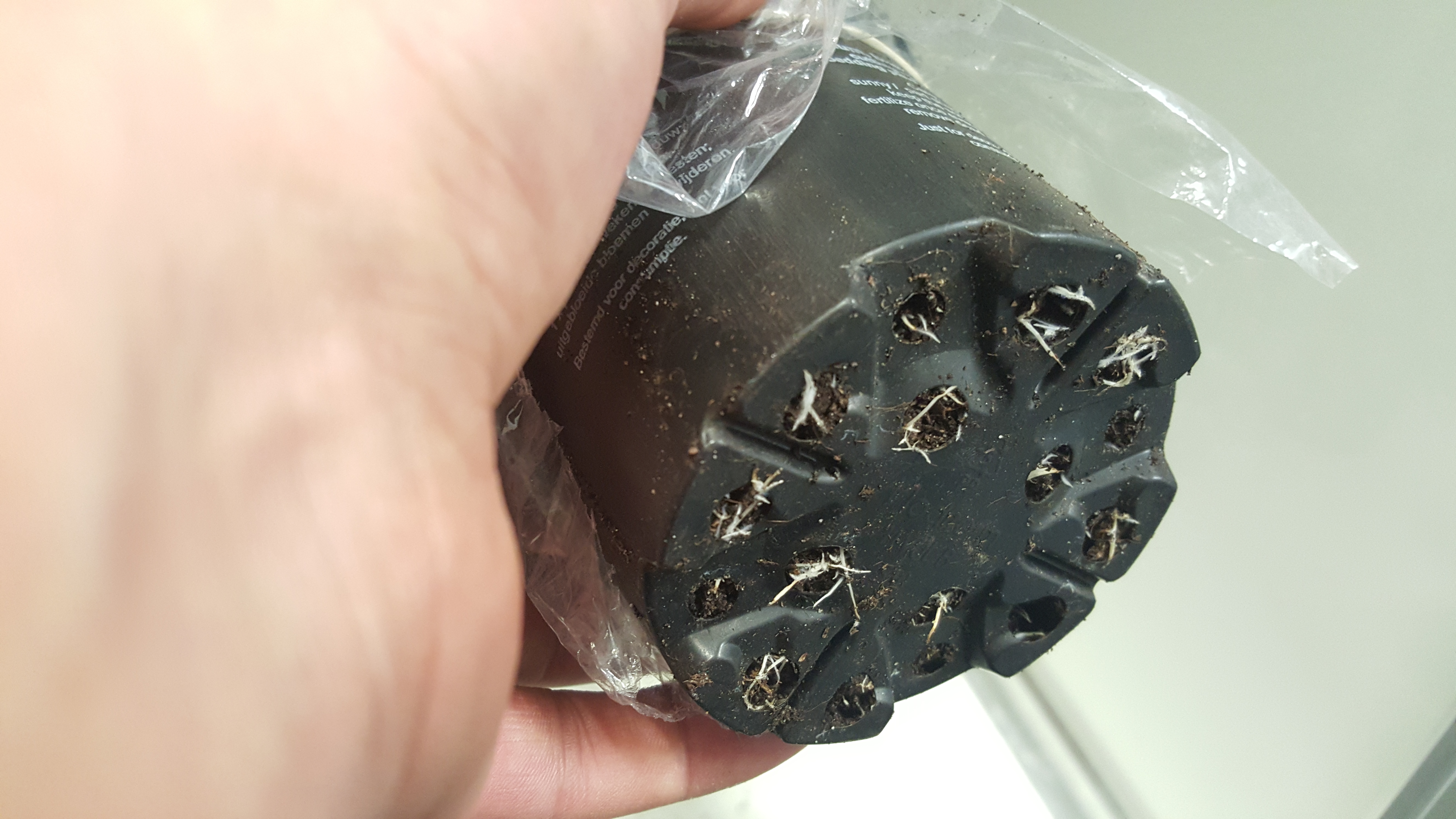 Hallo lieve lezers, toen ik vrijdag een kijkje in mijn kweekkastje nam, zag ik dat de jongedames hun potjes vrij snel hadden leeggedronken. Ik heb ze toen uiteraard water gegeven en de potjes afgedekt met een stukje plastic zodat er niet teveel water kon verdampen en de plantjes in het weekend genoeg te drinken zouden hebben. Toen ik vandaag terugkwam waren de potjes alweer bijna droog en zag ik dat er al veel worteltjes uit de onderkant van de potjes groeiden.
