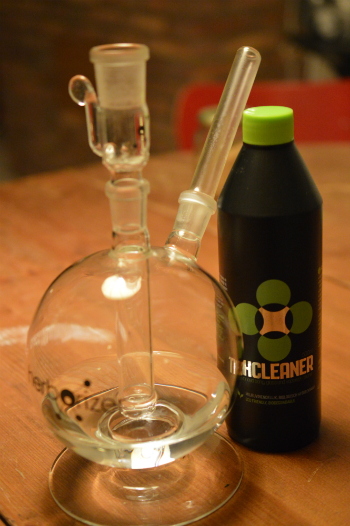 We hadden het spul al een tijdje in huis maar omdat een verdamper nu eenmaal niet zo snel vies wordt, moest de vuurdoop ervan toch nog even wachten. We wilden namelijk wel zeker weten of THCleaner onze bong ook echt goed schoon kreeg.