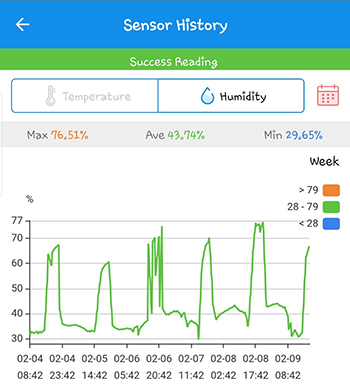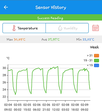 Het conflict met luchtvochtigheid vs. temperatuur is opgelost en de luchtvochtigheid is op niveau als de lamp uit is. Om de luchtvochtigheid wat hoger te krijgen, maak ik gebruik van een schaaltje warm water met een hoopje wc papier in het midden, waarop ik de ventilator richt. Niet mooi maar wel simpel en effectief. Op de datalogger Inkbird IBS-TH1 ziet het er als volgt uit.