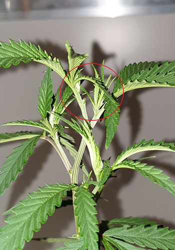 Aan de onderkant van de wietplanten heb ik de onderste twee takken weggeknipt. Deze groeien zo laag dat daar nooit goede toppen aan komen. Later zullen ze in de weg zitten bij het water geven, en de topjes die er eventueel aan zouden komen zijn de moeite van het knippen niet waard. Natuurlijk let ik wel op dat ik de ’trap’ voor de roofmijt niet wegknip.