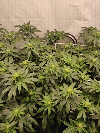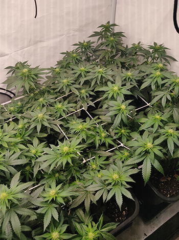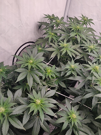 In de eerste anderhalve week van de bloeiperiode hebben onze negen dames een goede groeispurt doorgemaakt. Dat heeft ertoe geleid dat we ons net heel mooi hebben kunnen vullen, en daar zijn we uiteraard erg blij mee. Ook laten de eerste bloemen zich inmiddels zien. Dat is niet alleen een mooi aanzicht maar ook tijd om weer een aanpassing te maken in het voedingsregime, oftewel het dieet van de planten. Nu er bloemen gemaakt moeten worden, verandert de voedingsbehoefte namelijk ook.