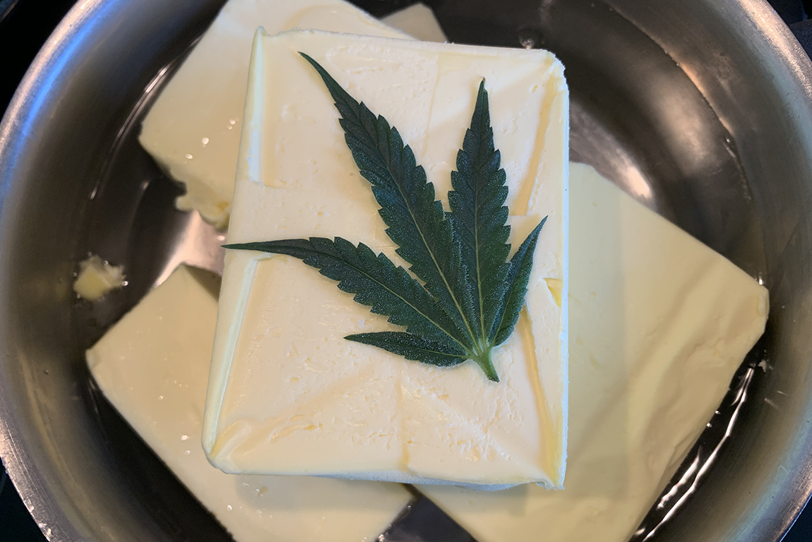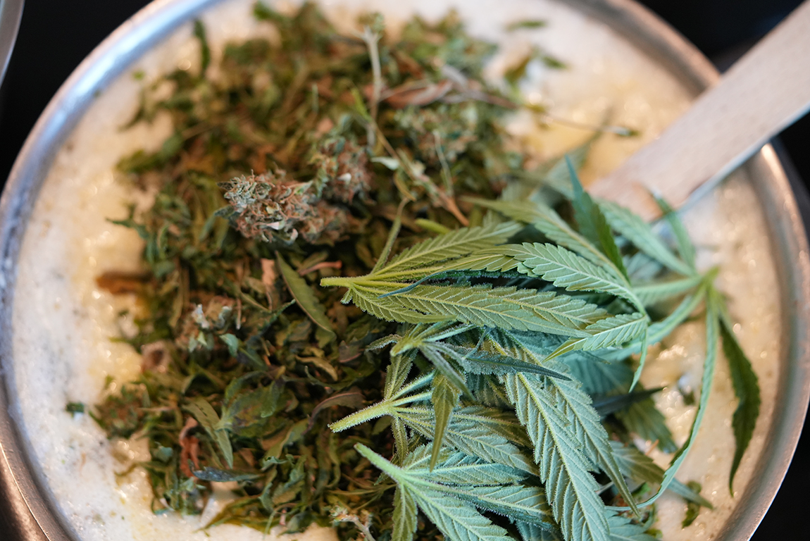 Omdat ik in de potten weer tegen de bodem aan begin te kijken, gaan er wederom gezeefde resten in de pan. Omdat ik Sneeze toch ging ontbladeren (en voor wat extra cannabinoïdezuren en verse terpenen) zijn deze bladeren vol trichomen ook in de pan beland. Met meer dan een kilo wietboter in de koelkast red ik het wel tot de volgende oogst.