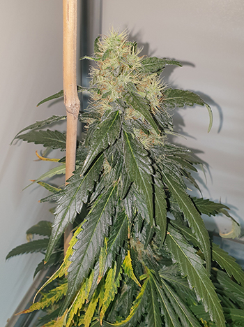 De tweede Morning Glory staat aan de linkerzijde van de G-kit XL en deze blokkeerde de schuifdeur met zijn hoofdtop. Ik heb geprobeerd om de top van de plant weer wat omhoog te richten maar dat is me niet gelukt. De dame is niet meer zo flexibel als toen ze jong was. Als ik haar probeer te buigen zakt ze meer terug naar deze vorm. Ik heb niet het gevoel dat het haar ontwikkeling in de weg staat, maar de tijd zal het uitwijzen. Ik laat haar voor nu lekker tegen de schuifdeur rusten en gebruikt de deur maar even niet. Het heen en weer geschuif van de deur zal de trichomen ook stuk maken en diens inhoud aan de deur smeren en dat is natuurlijk zonde!
